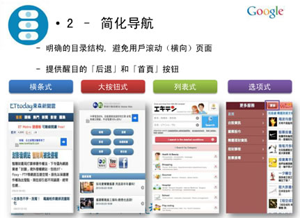 明确的目录结构,避免用户横向滚动页面,提供醒目的“后退”和“首页”按钮对于导航的目录结构,谷歌列出了四种常见的手机网站的导航形式,分别是:横条式、大按钮式、列表式、选项式。